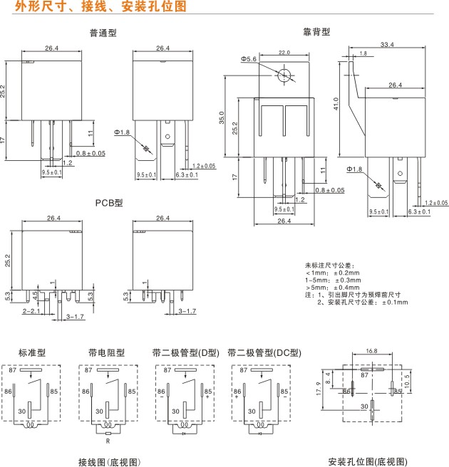 觸點(diǎn)形式繼電器常開或常閉(常見(jiàn)4、6只腳)、轉(zhuǎn)換(常見(jiàn)5只腳或8只腳)